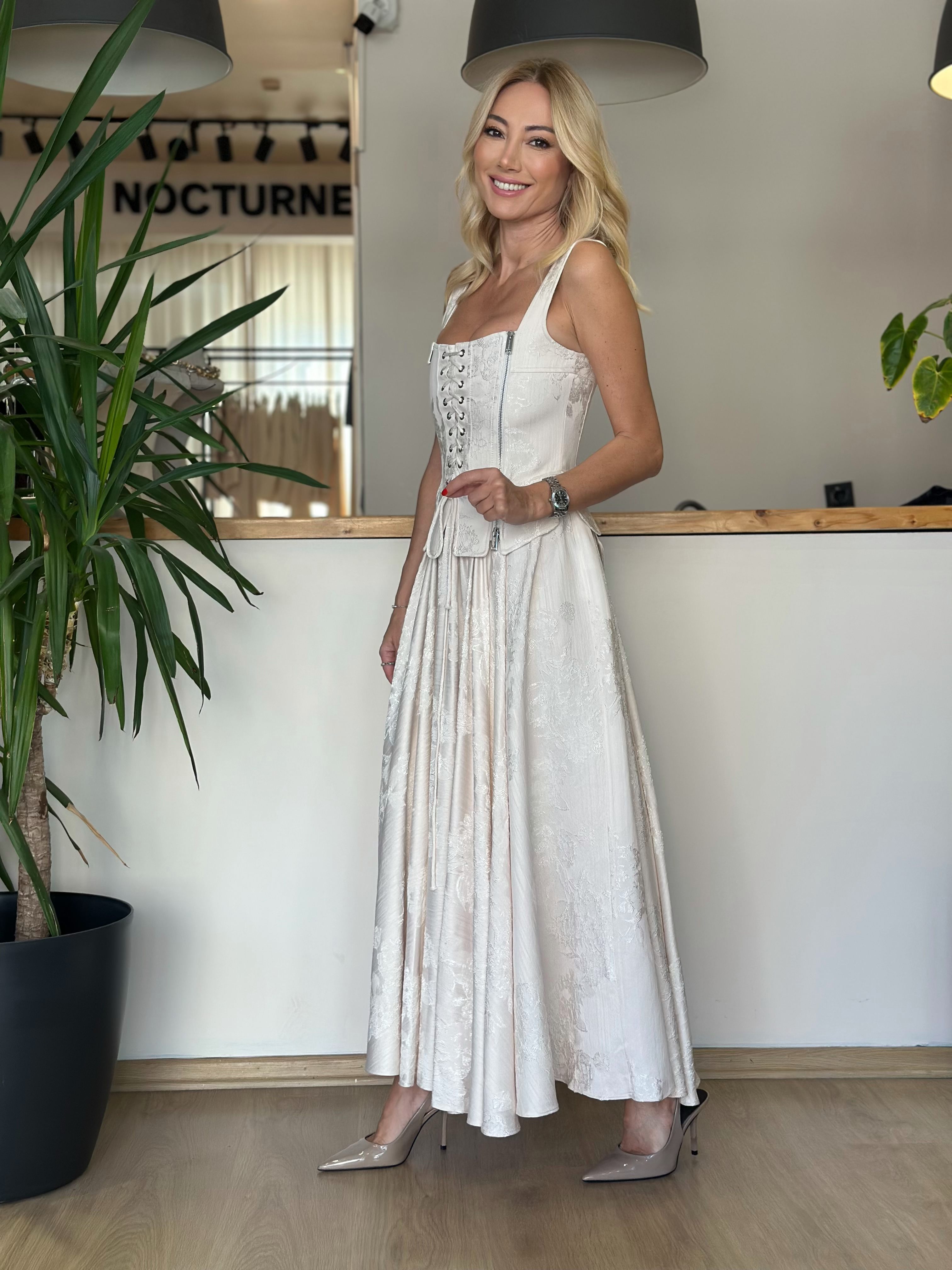 Ürün Açıklaması: Regular fit, tam kalıp, astarlı, dokuma, gizli fermuar kapamalı, kalın askılı, kare yaka, metal fermuarlı, kuşgözü bağlama detaylı midi boy elbise